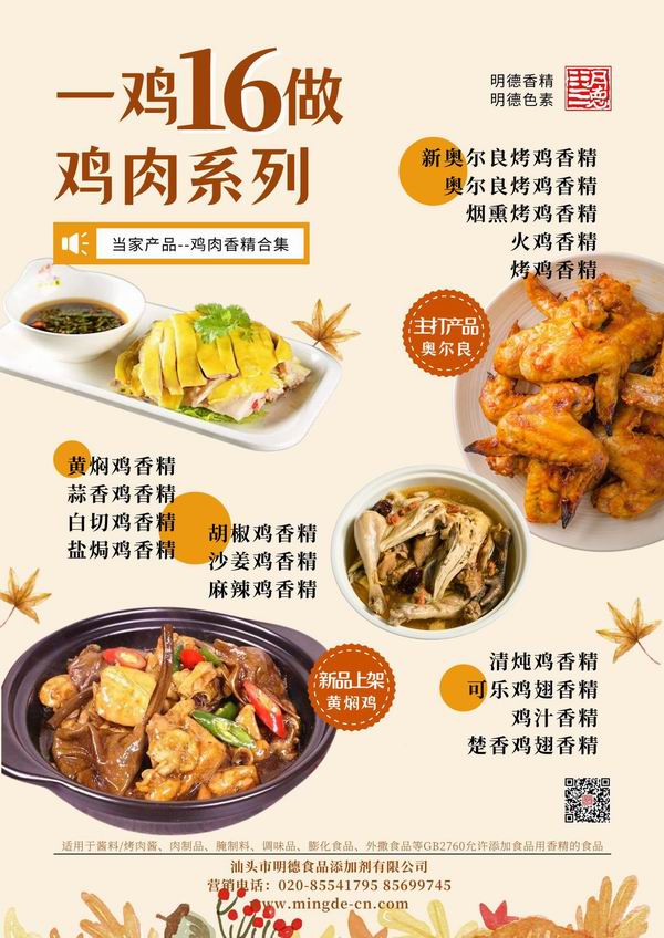 在雞肉香精領(lǐng)域我們潛心專研,結(jié)合市場潮流,消費(fèi)者喜好,汕頭市明德食品添加劑有限公司現(xiàn)有以下16種雞肉相關(guān)風(fēng)味的香精,供您選擇。并持續(xù)努力研發(fā)更多符合市場需求的風(fēng)味。