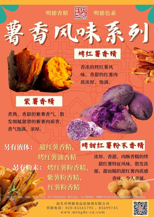 在薯味香精領(lǐng)域我們數(shù)十年潛心專研,迎合市場(chǎng)需求,滿足消費(fèi)者喜好,汕頭市明德食品添加劑有限公司,推出了多種風(fēng)味的番薯風(fēng)味香精,如:紫薯香精、紅薯香精、烤紫薯香精、烤紅薯香精、甜紅薯香精等。